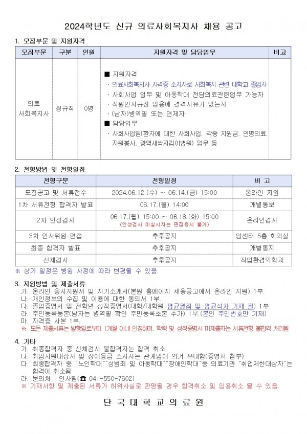 2024학년도 신규 의료사회복지사 채용 공고 페이지 정보 작성자 | 김동진 작성일 | 작성일24-06-12 10:06 조회 | 10,417회 댓글 | 0건 관련링크 이전글 다음글 목록 본문 이전글 다음글 목록