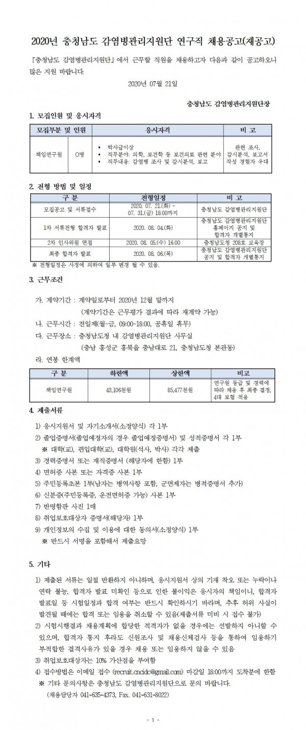 2020년 충남 감염병관리지원단 연구직 채용공고