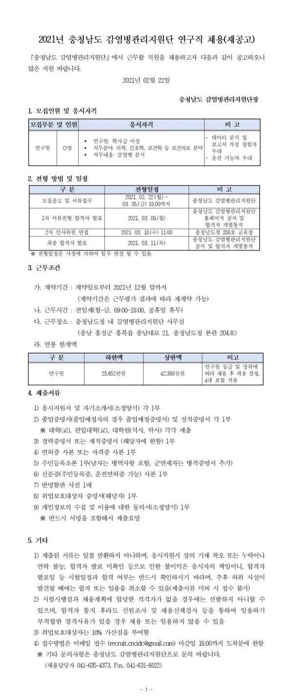 2021년 충청남도 감염병관리지원단 연구직 채용(재공고)