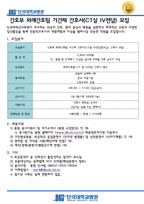 간호부 외래간호팀 기간제 간호사(CT실 IV전담) 모집