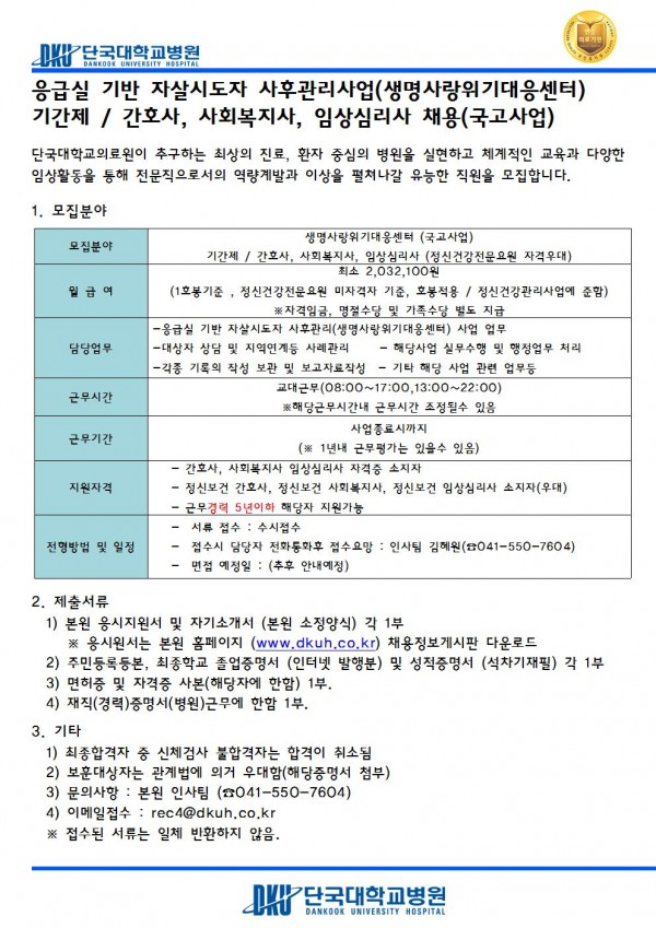 생명사랑위기대응센터(국고사업) 기간제(간호사/사회복지사/임상심리사) 모집