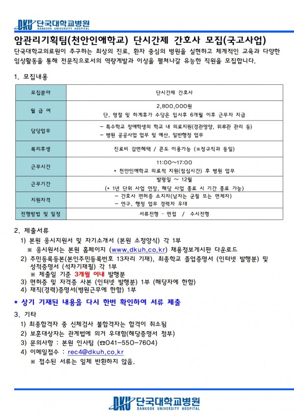 암관리기획팀(천안인애학교) 단시간제 간호사 모집(국고사업)