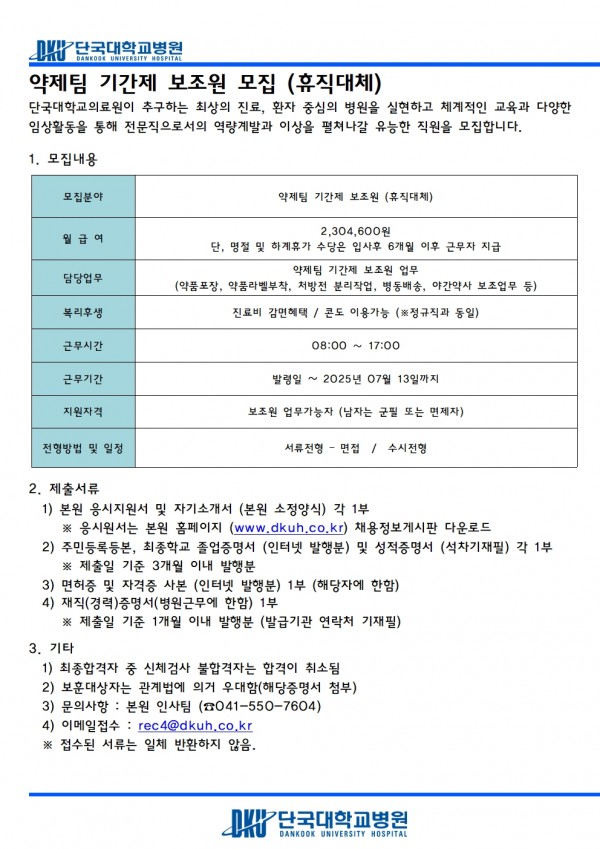 약제팀 기간제 보조원 모집 (휴직대체)