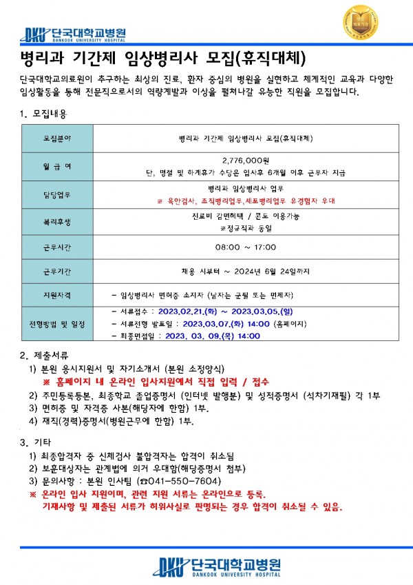 병리과 기간제 임상병리사 모집(휴직대체) 페이지 정보 작성자 | 김혜원 작성일 | 작성일23-02-21 17:29 조회 | 22,344회 댓글 | 0건 관련링크 이전글 다음글 목록 본문 이전글 다음글 목록