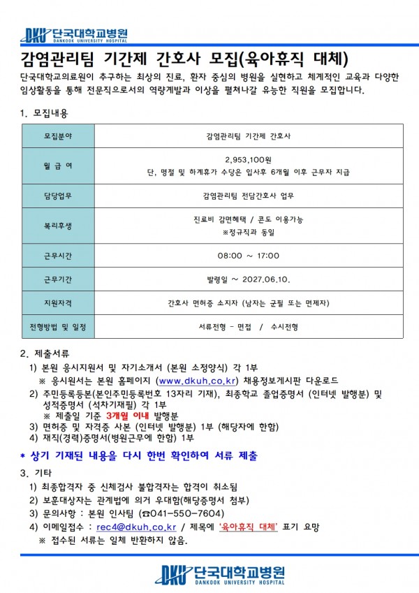 감염관리팀 기간제 간호사 모집(육아휴직 대체)