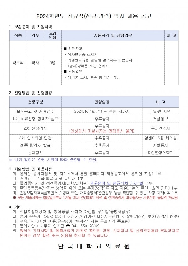 2024학년도 정규직(신규·경력) 약사 채용 공고