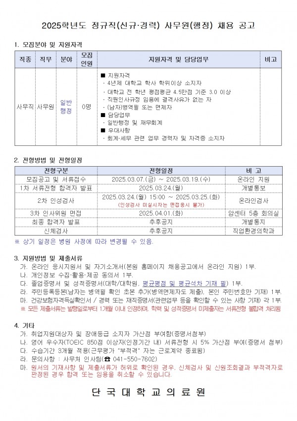 2025학년도 정규직(신규·경력) 사무원(행정) 채용 공고