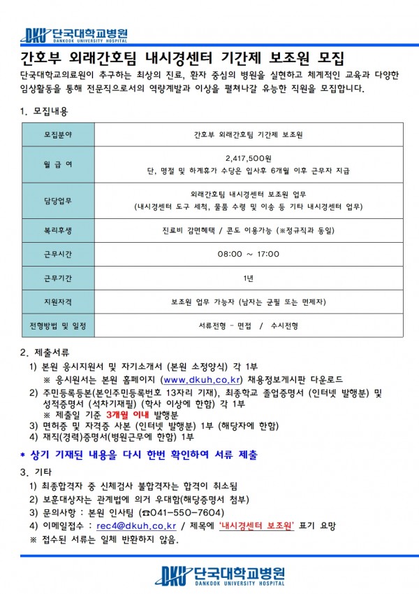 간호부 외래간호팀 내시경센터 기간제 보조원 모집