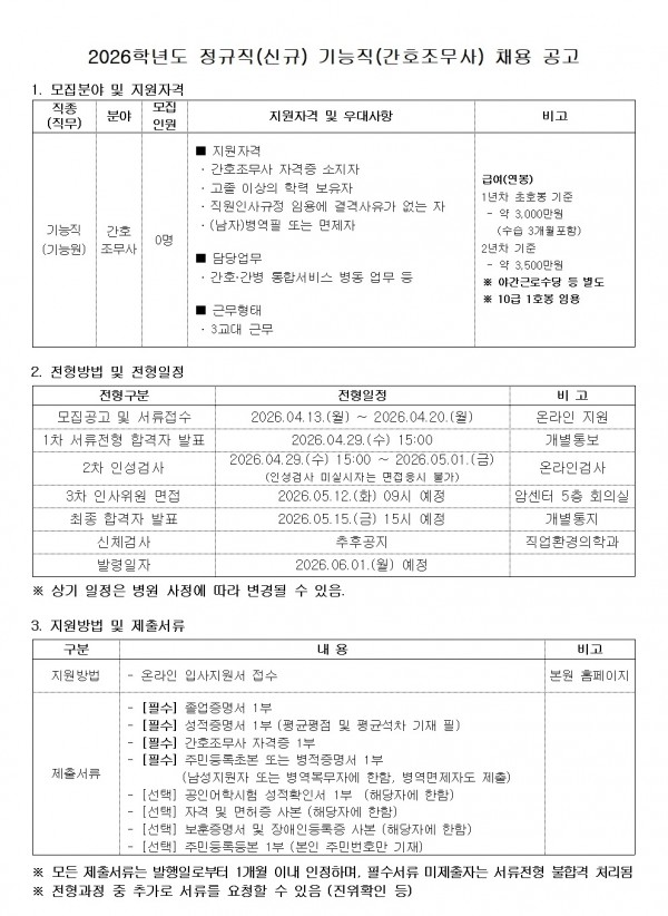 2026학년도 정규직(신규) 기능직(간호조무사) 채용