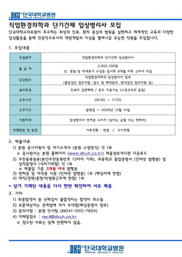 직업환경의학과 단기간제 임상병리사 모집