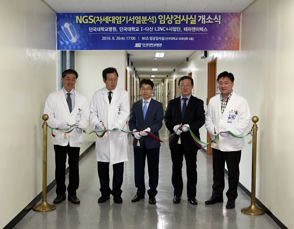 단국대병원(병원장 조종태)이 9월 26일 NGS(차세대 염기서열분석, Next Generation Sequencing) 임상검사실 개소식을 갖고 본격적인 운영에 들어갔다. 개소식에 앞서 단국대학교 I-다산 LINC+사업단, ㈜테라젠이텍스와 유전체 기반의 정밀의료 서비스를 위해 3자 업무협약도 체결했다. 이로써 단국대병원은 암유전체 정보 분석 및 임상 진단에 따른 환자별 맞춤치료를 할 수 있는 선진 의료서비스를 제공할 수 있게 됐다. 병원은 이미 지난 8월 보건복지부로부터 ‘NGS 기반 유전체 패널검사 실시기관’으로 지정받은 바 있다.