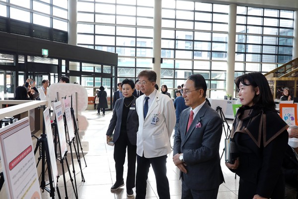 (아동학대 예방의 날의 날을 맞아 박상돈 천안시장과 김재일 병원장이 로비에 전시된 액자를 둘러보고 있다)