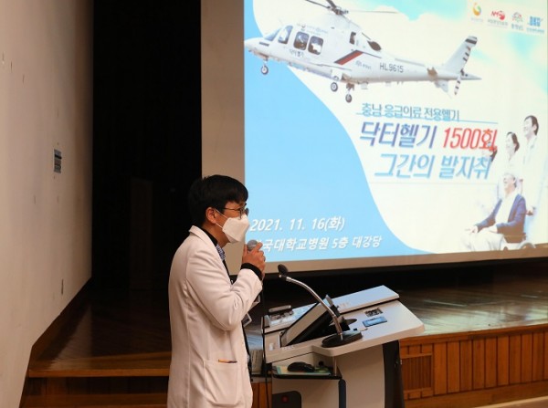 이어 고찬영 응급의학과 교수는 ‘닥터헬기 1500회까지의 발자취’에 대해 소개했다. 출범 첫해 237명 환자 이송을 시작으로 2019년에는 339건까지 증가했으나 2020년 코로나19 상황으로 절반 이하로 감소해 올해 11월 현재 132건을 이송한 것으로 나타났다. 첫 출동 이후 100회 달성까지 평균 3.9개월이 소요됐다. 닥터헬기가 가장 일찍 출동한 시간은 새벽 5시 22분, 가장 늦게 출동한 시간은 오후 7시 7분이었다. 또한, 가장 많이 출동한 의료진은 1500회 중 348회를 탑승해 신속하고 빠른 처치로 중증응급환자의 골든아워를 사수하며 생명의 구명줄 역할을 했다. 장고도 등 서해안의 섬도 6곳에 22회 출동했으며, 가장 멀리 갔던 섬은 외연도로 단국대학교병원에서 120㎞ 떨어진 곳이었다.