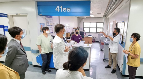 코로나19로 인한 비대면, 집합금지가 지속되는 상황에서도 환자안전 문화 정착을 위한 ‘환자안전 경영진 라운드’는 경영진의 리더십 전략의 일환으로 매달 시행되고 있다. 지난 8월 20일에는 연간 일정에 따라 41병동(정신건강의학과)에 대한 ‘환자안전 경영진 라운드’가 시행되었다. 진료·간호·환자안전 및 시설·환경·화재 안전관리 점검 등이 이루어졌으며, 2022년 시행 예정인 4주기 정신의료기관 평가에 대비해 실질적인 논의 후 단계적으로 활동을 추진하기로 했다.