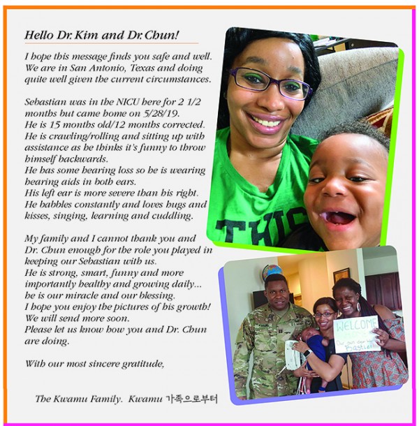 다른 아이들보다 세상에 조금 일찍 나온 세바스티안은 호흡곤란과 출혈, 지속적인 경련과 수술과정을 겪었습니다. 세바스티안의 가족들은 그를 향해 수없이 도사리고 있는 감염 위험으로부터 늘 긴장을 늦추지 않고 환아상태를 살피며 밤낮없이 치료해주던 우리 병원 소아청소년과 천상우, 김지선 전공의를 포함한 의료진들을 잊지 않고 한참 성장 중인 세바스티안의 사진과 함께 감사의 편지를 보내왔습니다.![]()