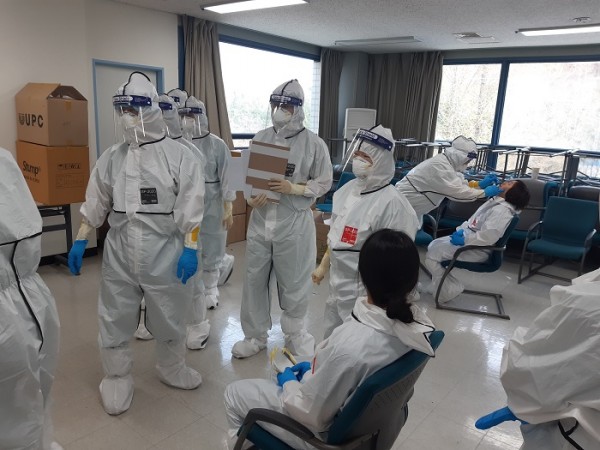 우리 병원은 이들에 대한 코로나19 진단검사를 위해 의사 4명, 간호사 4명, 행정지원 3명씩 구성된 2팀으로 지원단을 구성하였으며, 검사 전 혹시 모를 감염을 예방하기 위해 방호복 착의와 탈의에 대한 교육을 시행했다.