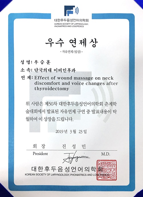단국대병원(병원장 조종태) 이비인후과 우승훈 교수(46세)가 지난 23일 창원경상대학교병원에서 열린 제50차 대한후두음성언어의학회 춘계학술대회에서 우수연제상을 수상했다.