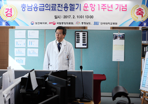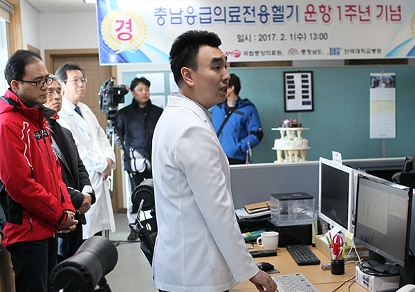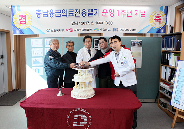 이를 기념하기 위해 단국대병원(병원장 박우성)은 1일 병원 운항통제실에서 충남닥터헬기 운항 1주년을 축하하는 행사를 가졌다. 박우성 병원장은 출범 이후 1년 동안 응급환자의 생명을 지키기 위해 노력한 항공의료팀에 감사의 뜻을 전한 후 “의료진의 신속한 응급처치와 빠른 이송이 가능했던 닥터헬기 덕분에 중증외상환자, 긴급을 요하는 심장질환이나 뇌혈관질환 등 3대 중증 응급질환의 사망률을 감소시킬 수 있었다”고 말했다. 이어 “닥터헬기가 응급환자의 골든타임을 지켜내고 있는만큼 충남지역을 비롯하여 안성·세종시 등 인근지역의 응급환자들도 닥터헬기를 이용할 수 있도록 운항지역을 확대해 나갈 것”이라고 덧붙였다.