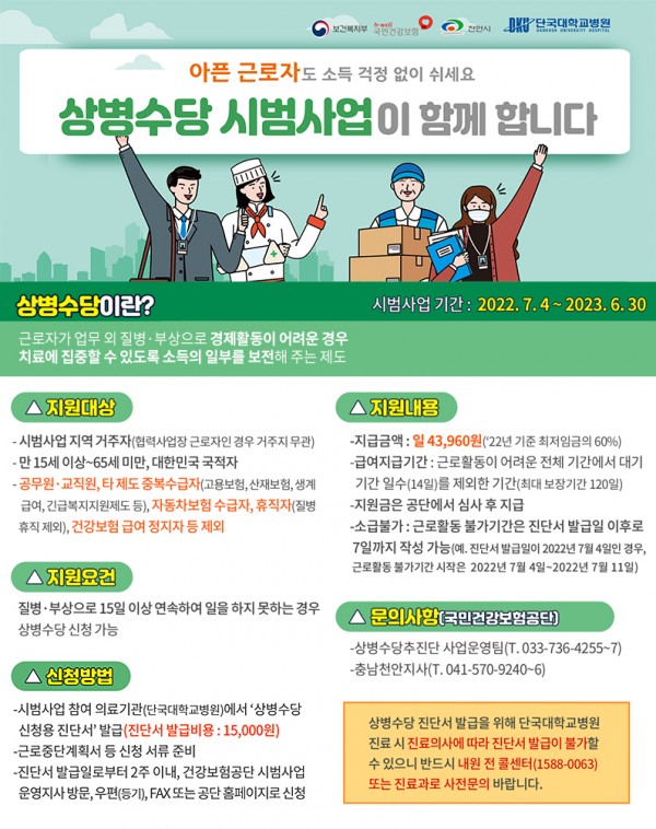 문의는 국민건강보험 상병수당추진단 사업운영팀(033-736-4255~7)이나 국민건강보험공단 충남천안지사(041-570-9240~6)로 하면 된다.