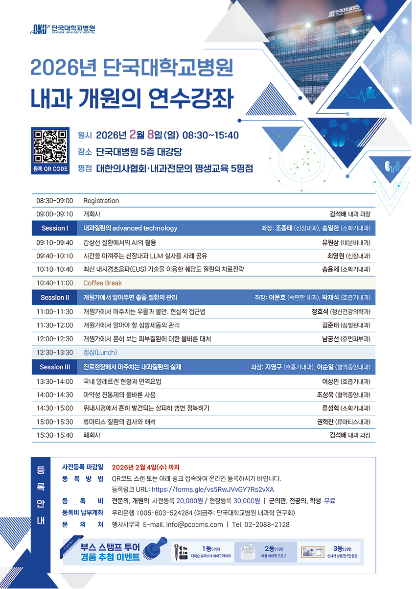 [2026. 2. 8] 2026년 단국대학교병원 내과 개원의 연수강좌 안내 > 병원소개 > 병원소식 > 공지사항 | 사랑이 숨쉬는 인술의 요람 - 단국대학교병원 홈페이지입니다.