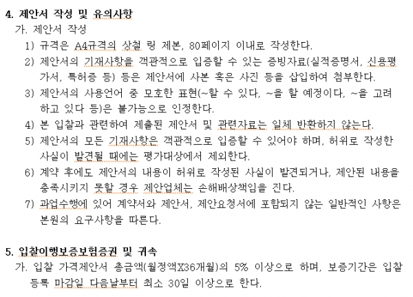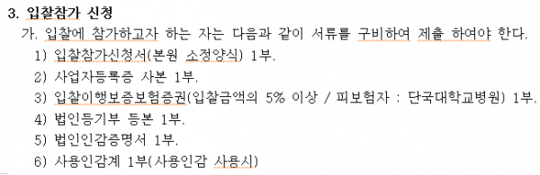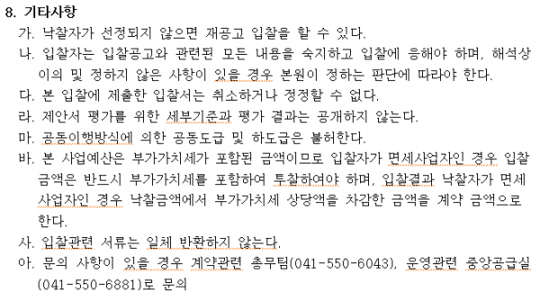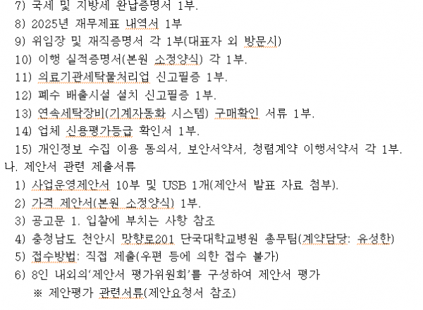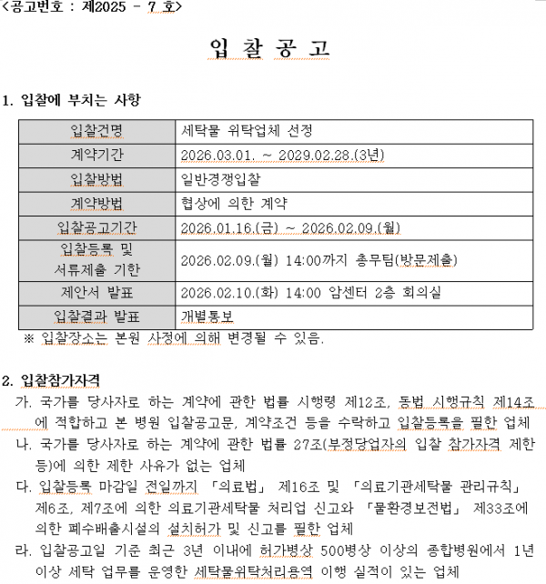 세탁물 위탁업체 선정 공고 페이지 정보 작성자 |유성한 작성일 |2026-01-16 17:34 조 회 |142회 댓 글 |0건 첨부파일 첨부파일 | 1-1 입찰공고문.hwp (103.5K) 첨부파일 | 1-2 입찰참가서류.hwp (99.5K) 첨부파일 | 1-3 입찰 유의서.hwp (61.5K) 첨부파일 | 1-4 세탁물위탁처리 시방서.hwp (68.5K) 관련링크 이전글 다음글 목록 본문 이전글 다음글 목록