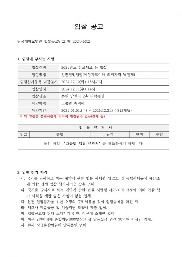 2025년 진료재료 등 입찰 페이지 정보 작성자 |표건우 작성일 |2024-12-04 08:46 조 회 |3,034회 댓 글 |0건 첨부파일 첨부파일 | 3. 2025년 진료재료등 입찰 A그룹.xlsx (623.3K) 첨부파일 | 3. 2025년 진료재료등 입찰 B그룹.xlsx (798.5K) 첨부파일 | 3. 2025년 진료재료등 입찰 C그룹.xlsx (470.5K) 첨부파일 | 3. 2025년 진료재료등 입찰 D그룹.xlsx (470.5K) 첨부파일 | 입찰참가자격등록신청서 최종.hwp (49.0K) 첨부파일 | 청렴계약이행서약서.pdf (61.6K) 관련링크 이전글 다음글 목록 본문 이전글 다음글 목록
