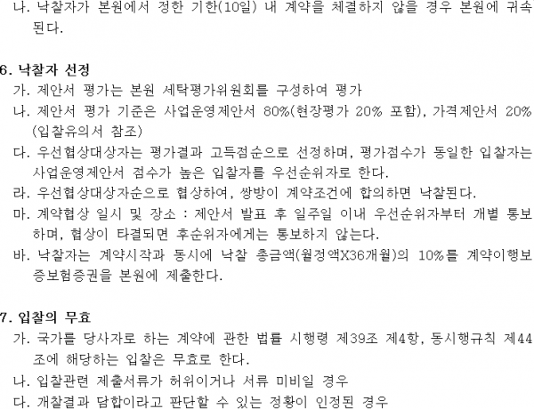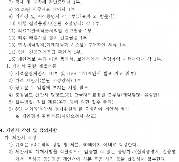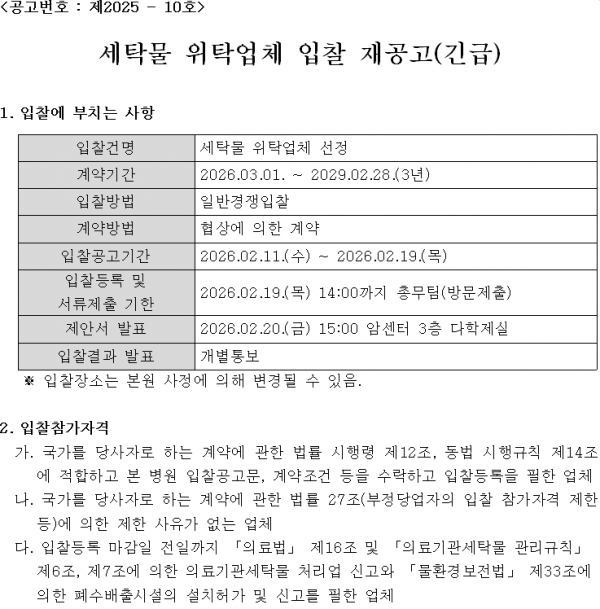 세탁물 위탁업체 선정 재공고(긴급) 페이지 정보 작성자 |유성한 작성일 |2026-02-11 16:58 조 회 |45회 댓 글 |0건 첨부파일 첨부파일 | 1-1 입찰재공고문.hwp (55.5K) 첨부파일 | 1-2 입찰참가서류.hwp (99.5K) 첨부파일 | 1-3 입찰 유의서.hwp (61.5K) 첨부파일 | 1-4 세탁물위탁처리 시방서.hwp (68.5K) 관련링크 이전글 다음글 목록 본문 이전글 다음글 목록
