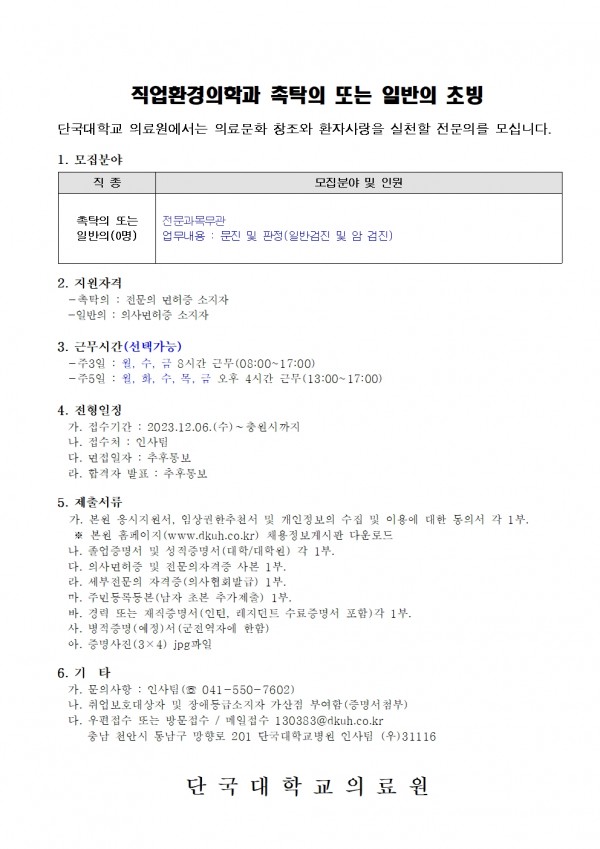 직업환경의학과 촉탁의 또는 일반의 초빙
