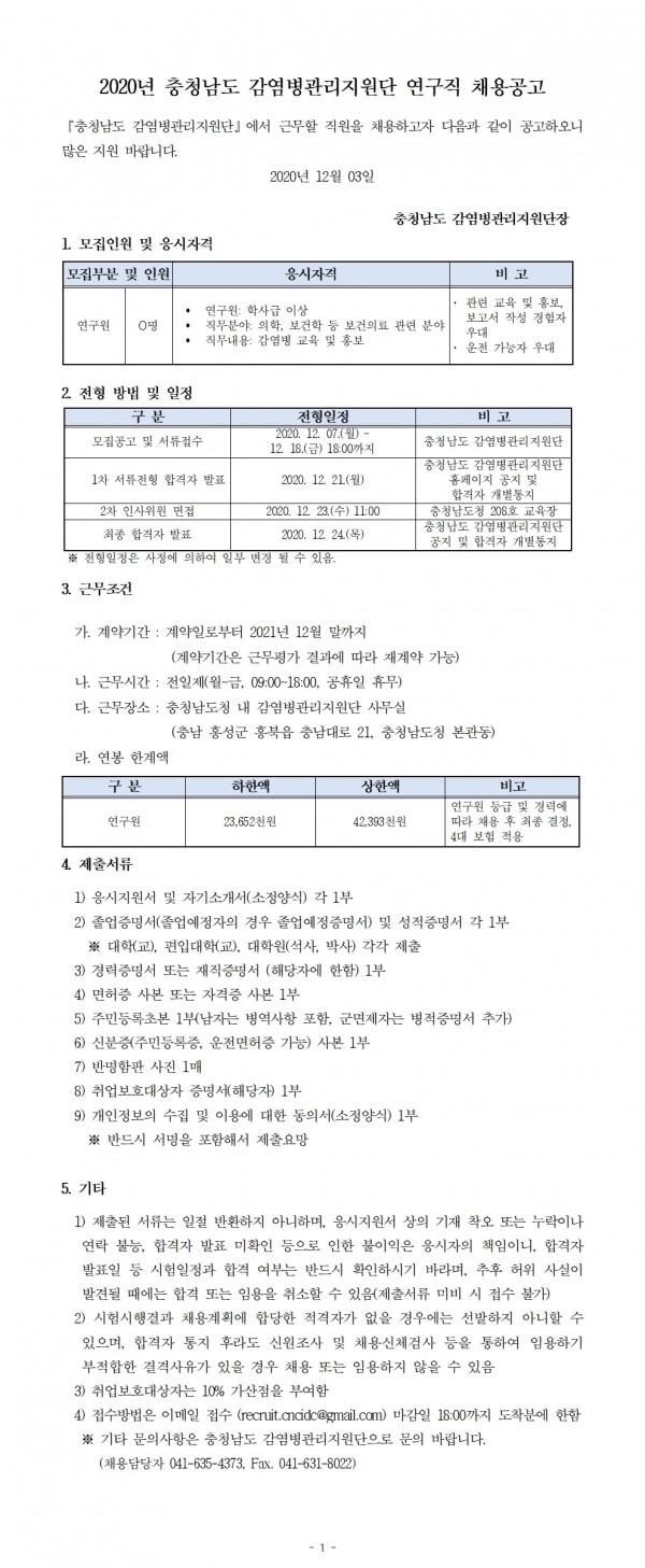 2020년 충청남도 감염병관리지원단 연구직 채용