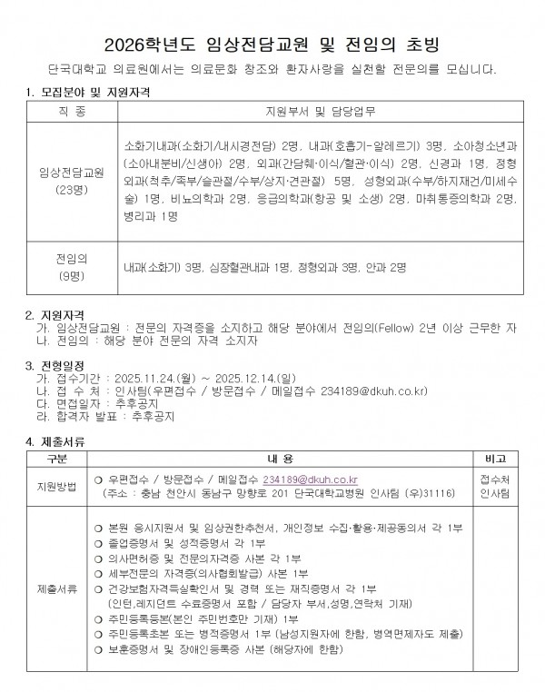 2026학년도 임상전담교원 및 전임의 초빙