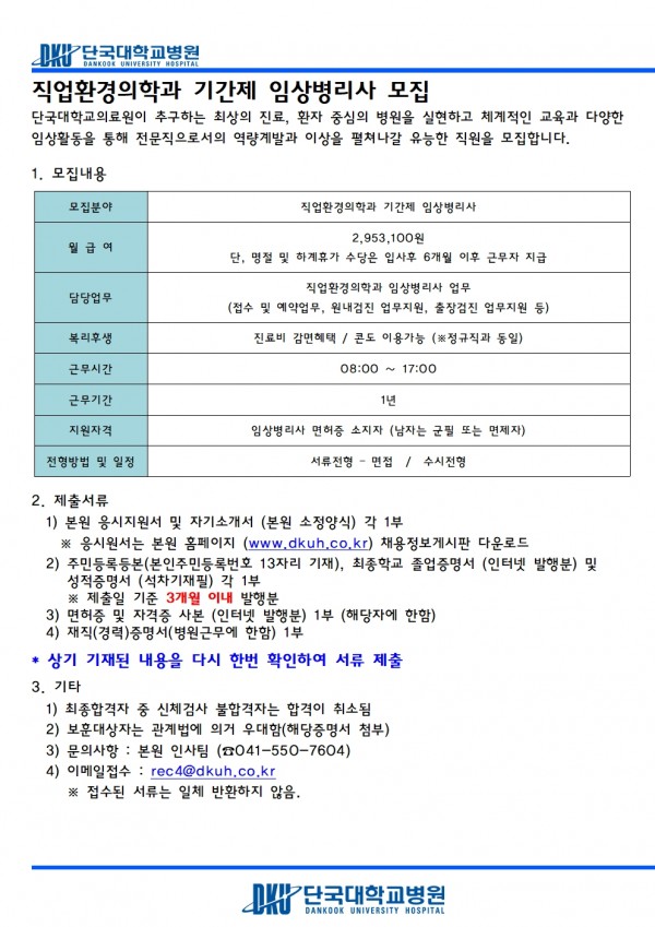 직업환경의학과 기간제 임상병리사 모집
