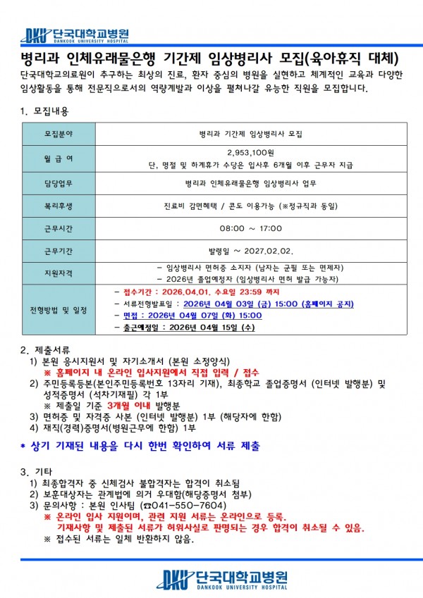 병리과 인체유래물은행 기간제 임상병리사 모집(육아휴직 대체) > 병원소개 > 병원소식 > 채용공고 | 사랑이 숨쉬는 인술의 요람 - 단국대학교병원 홈페이지입니다.