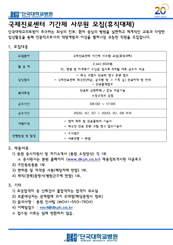 국제진료센터 기간제 사무원 모집(휴직대체)