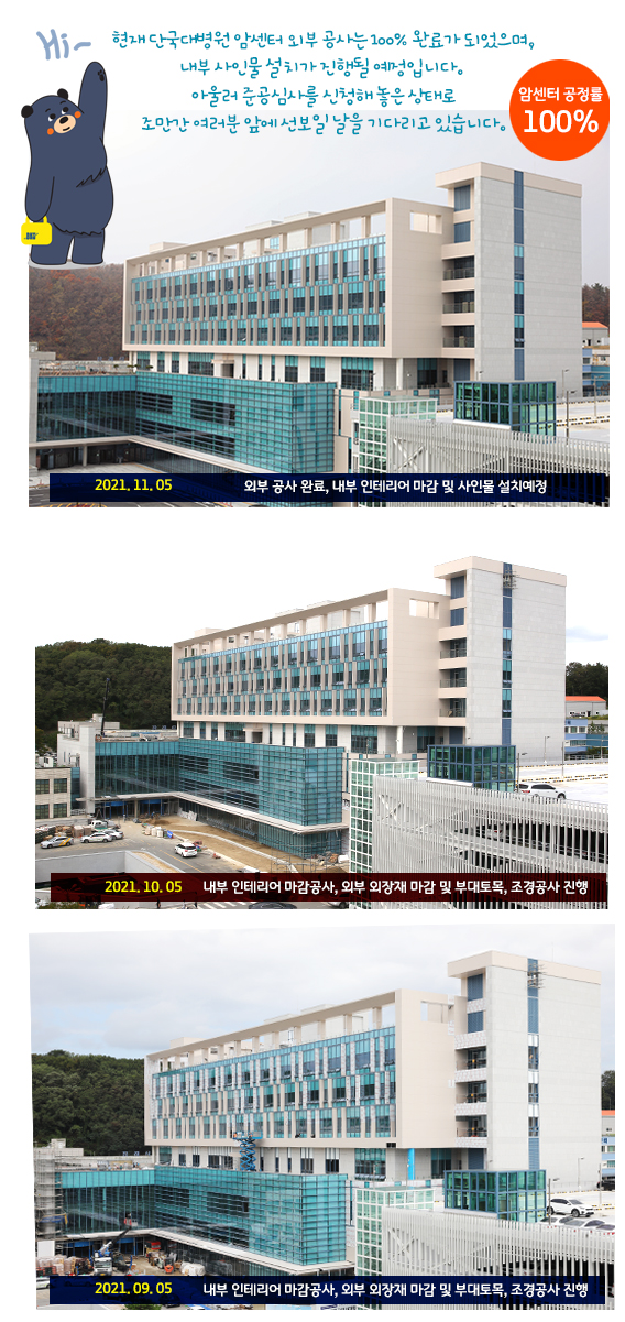 단국대학교병원 암센터 건립 현황(2021. 11. 05 현재) 페이지 정보 작성자 |관리자 작성일 |2021-11-05 00:00 조 회 |4,341회 댓 글 |0건 관련링크 다음글 목록 본문 다음글 목록