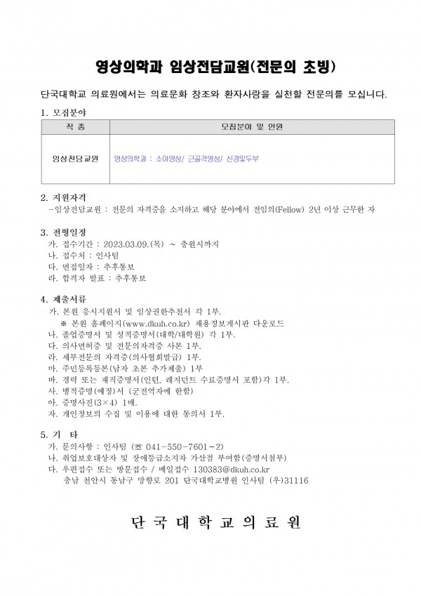 영상의학과 임상전담교원(전문의 초빙) 작성자 장회진 2023-03-08 14:26 조회13,906회 담당부서 : 인사팀문의번호 : 041-550-7602최종수정일자 : 2018-03-07 관련링크 본문